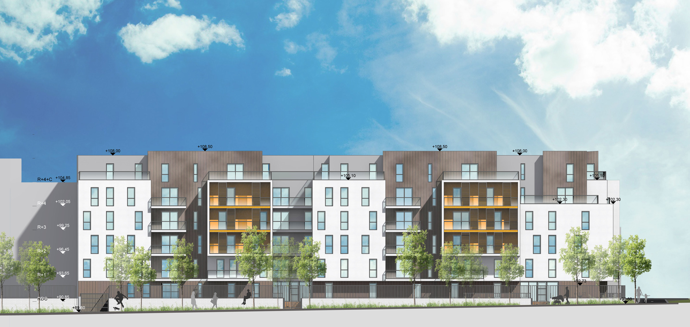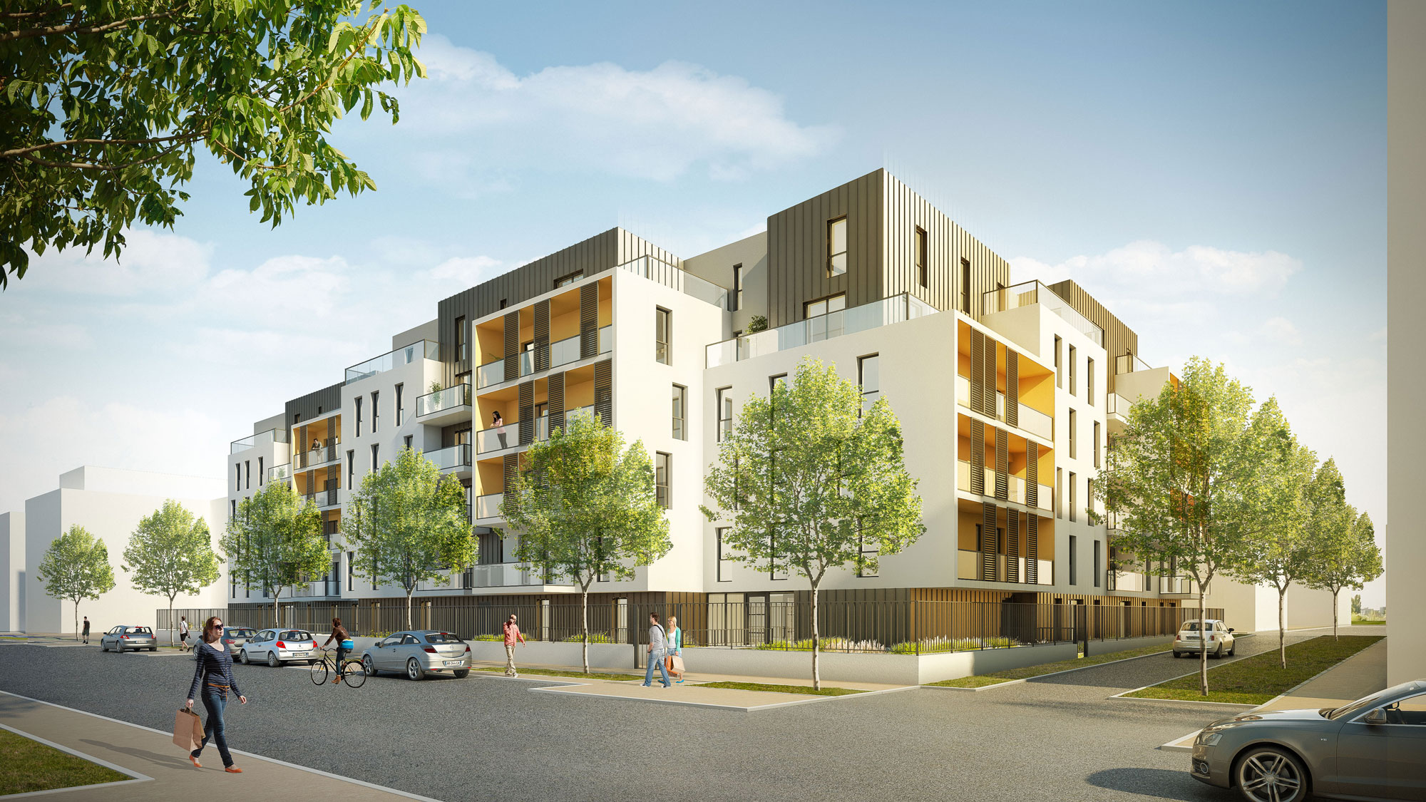 Projet d’un ensemble de 100 logements collectifs sur un socle de parkings partiellement enterrés. Situé en bordure de ZAC, ce projet propose une volumétrie découpée pour s’adapter à l’échelle du vis à vis, avec un traitement d’angle qui appelle à la découverte du nouveau cœur de quartier.
