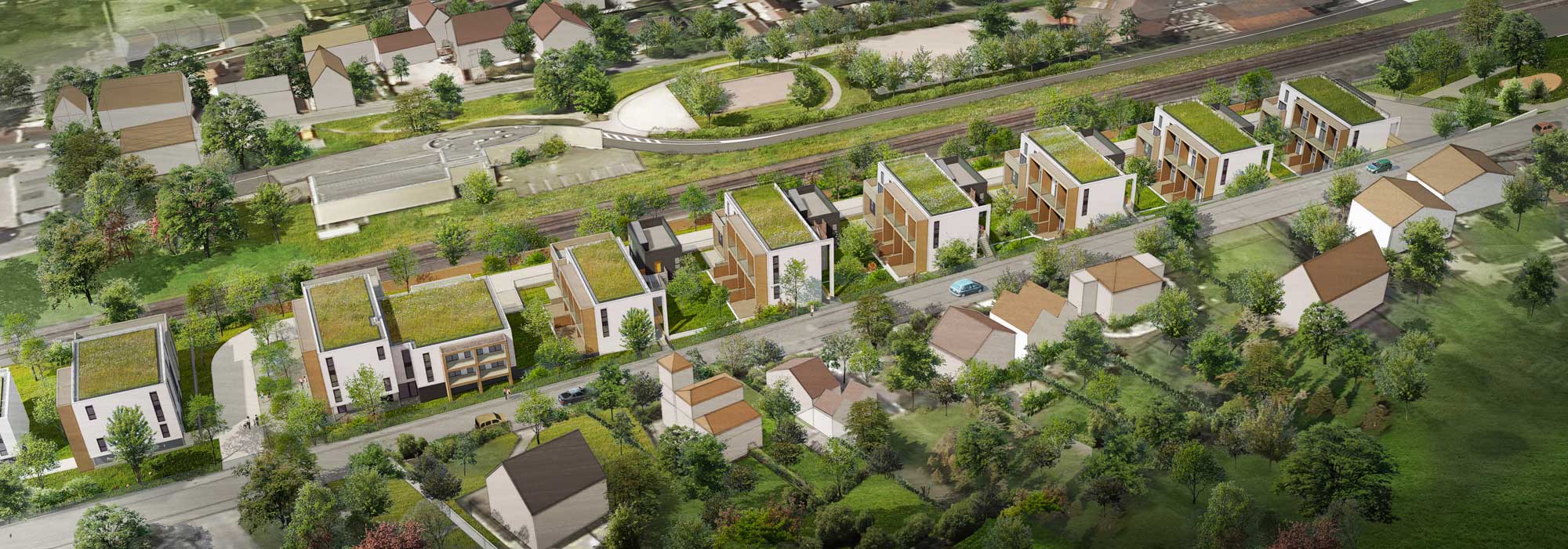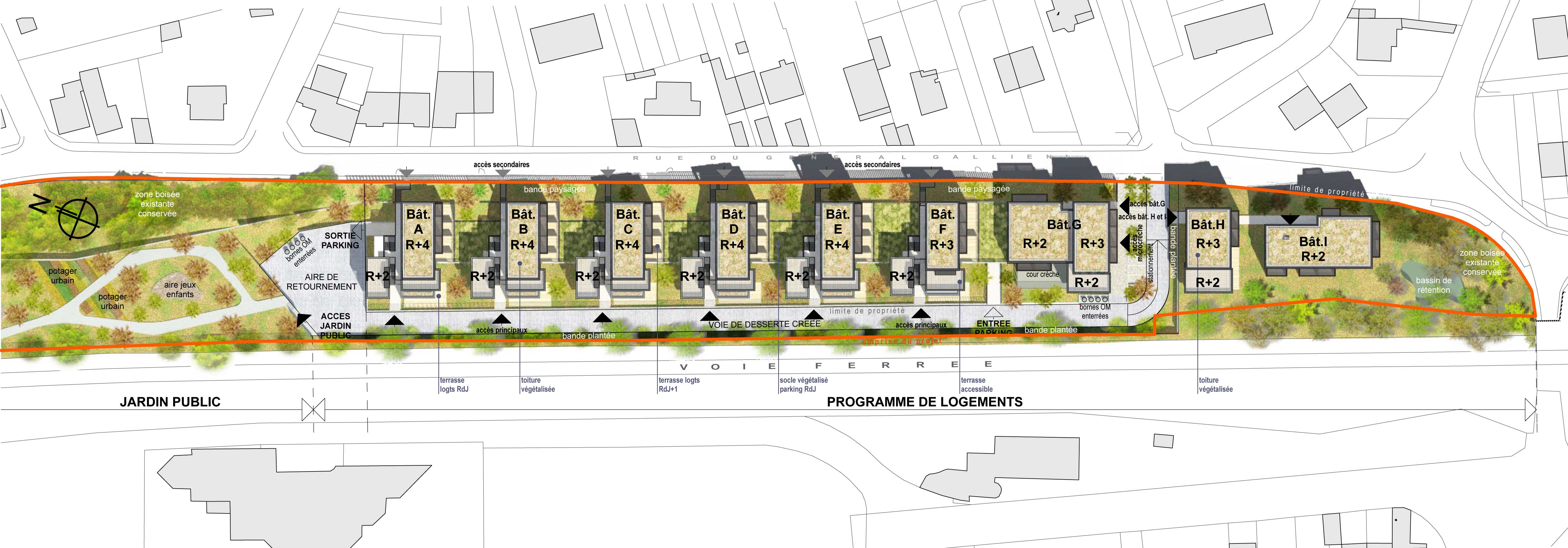 Les nombreuses contraintes concentrées sur ce terrain tout en longueur, avec une voie ferrée à l’ouest, un talus à l’est et des transparences souhaitées pour les parcelles situées en amont, ont dicté ce parti de 9 bâtiments disposés en peigne, encastrés dans le talus et reposant sur un socle commun de parkings accessibles de plain-pied.
