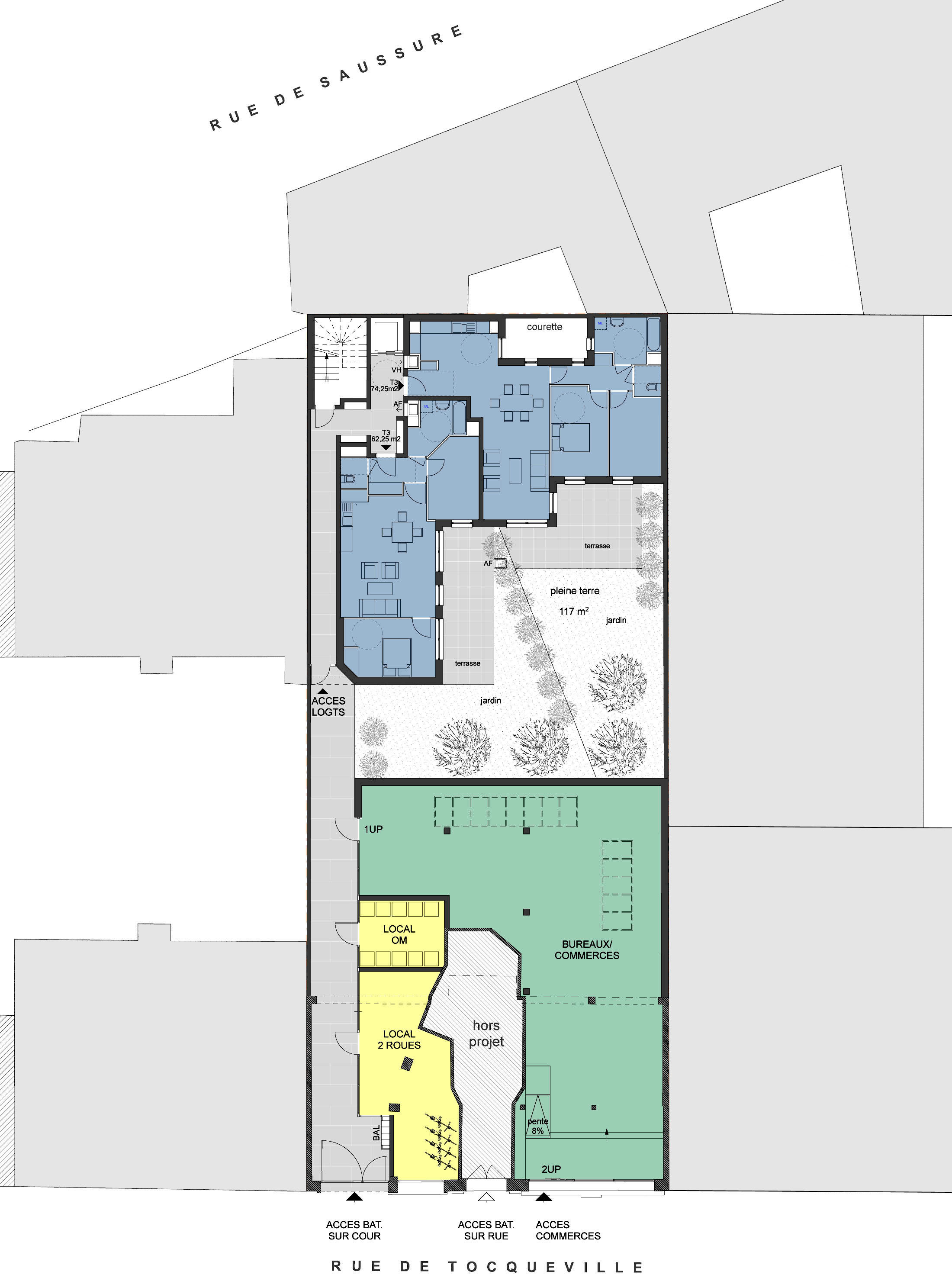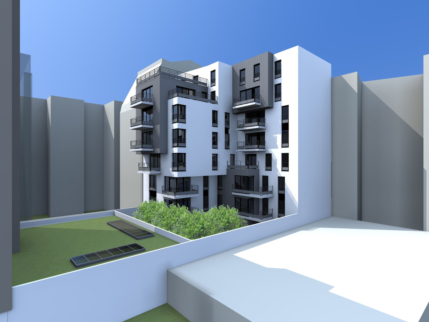 Projet d’un ensemble de 14 logements collectifs destinés à l’accession et d’un local commercial, situés en cœur d’îlot en lieu et place d’un garage et s’appuyant sur un ensemble de murs pignons aveugles de bâtiments mitoyens.