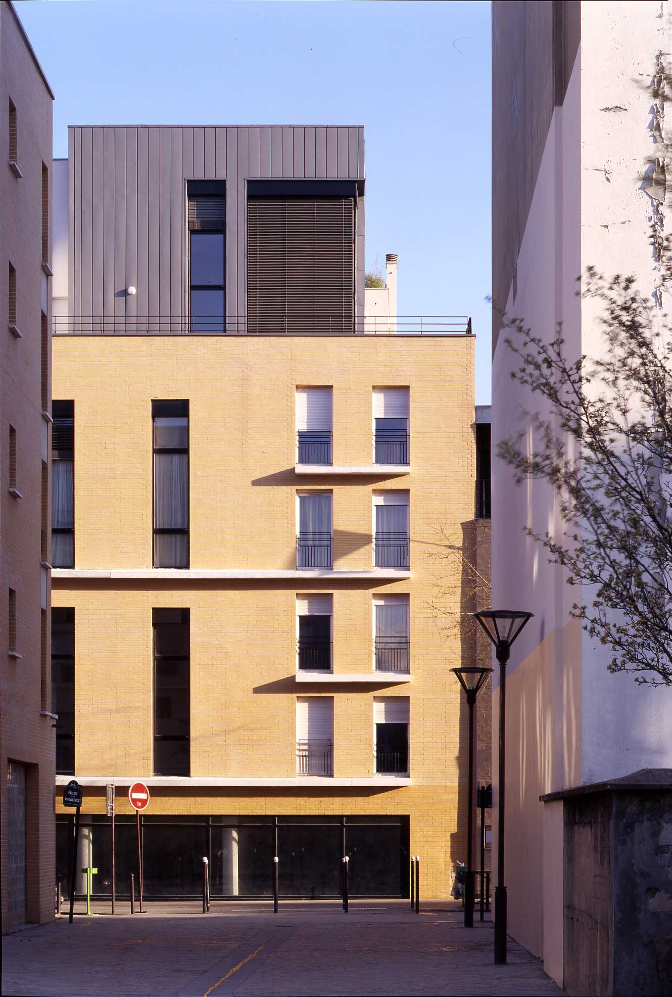 Réalisation de 28 logements collectifs sociaux dont 10 ateliers d’artistes associés à des 2P, ainsi qu’un local d’activités à rez-de-chaussée. Ce projet qui occupe la totalité de la parcelle, bénéficie de droits de vues sur l’intérieur de l’îlot et comprend en sous-sol deux niveaux de parkings accessibles par un ascenseur à voitures.