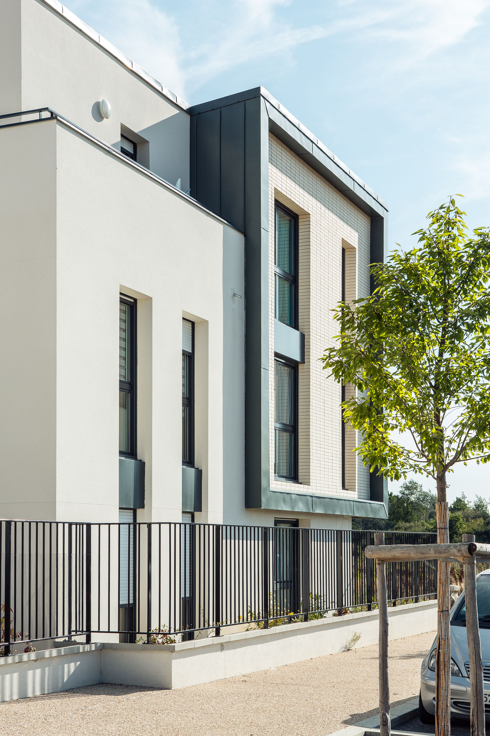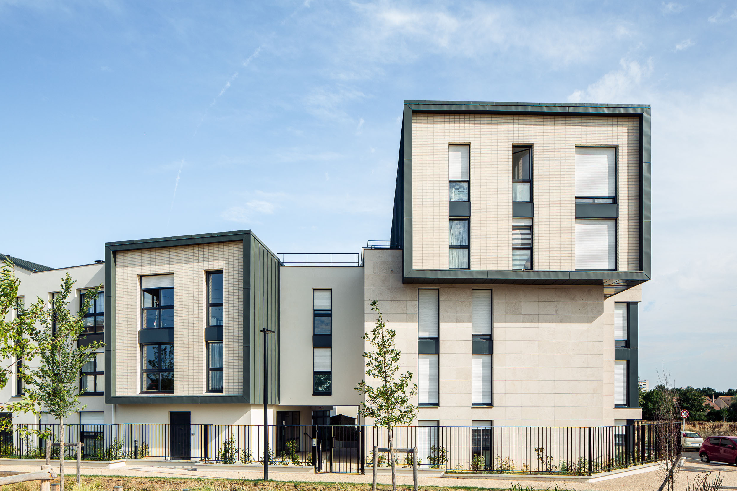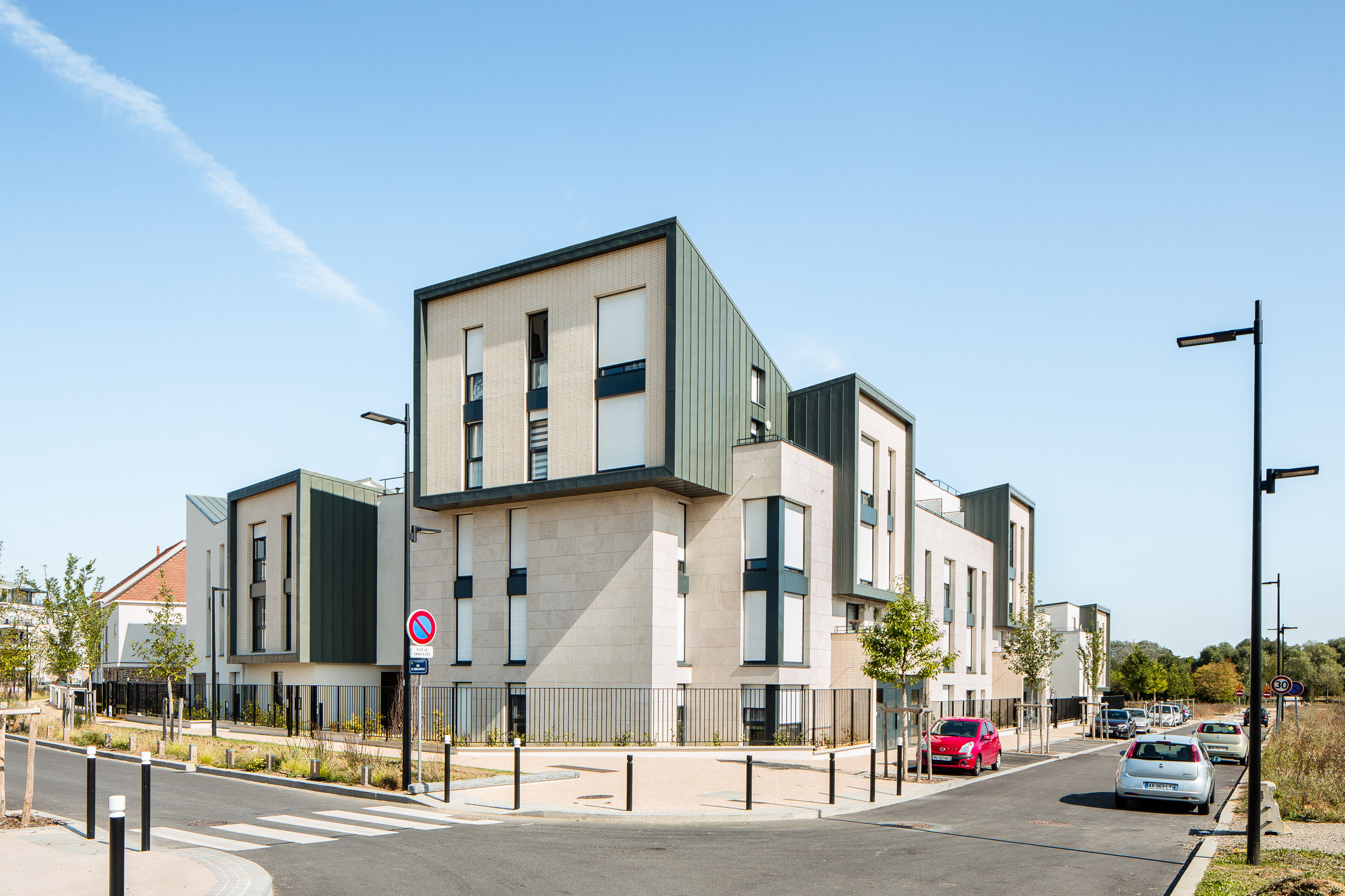 Projet phare marquant l’entrée de la ZAC, dont les volumes décroissent et se morcellent progressivement pour favoriser une transition douce avec les parcelles pavillonnaires mitoyennes.