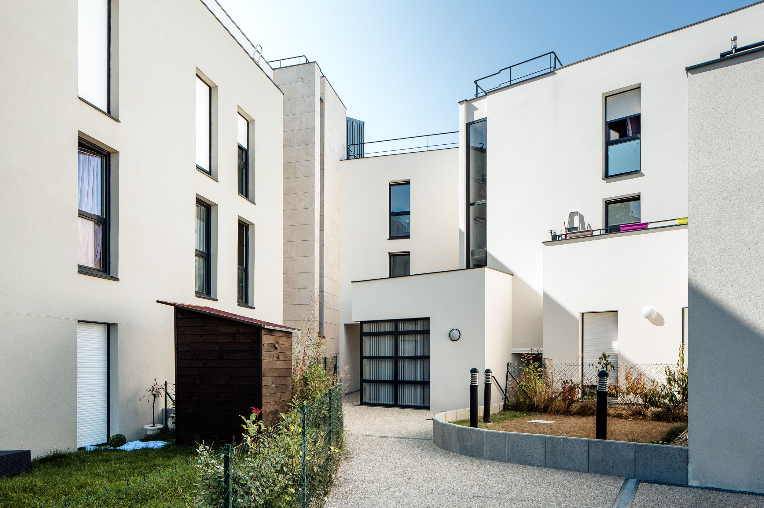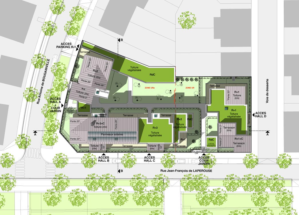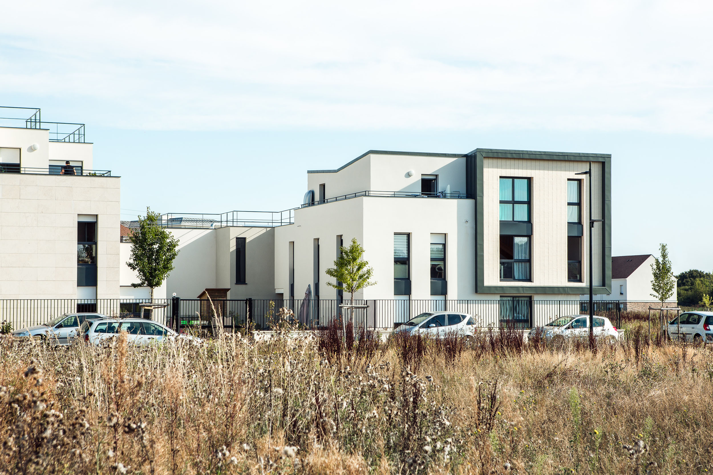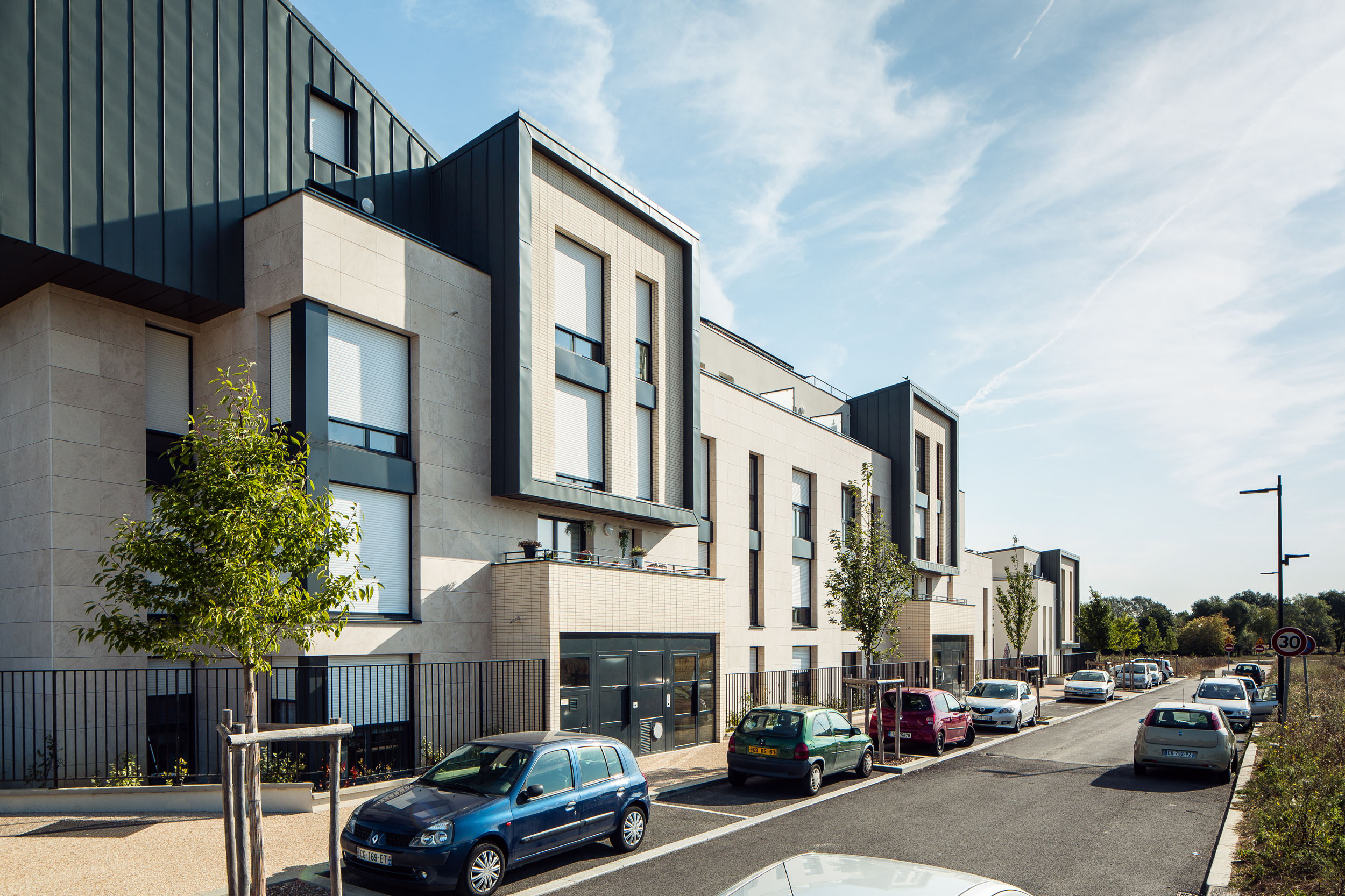 Projet phare marquant l’entrée de la ZAC, dont les volumes décroissent et se morcellent progressivement pour favoriser une transition douce avec les parcelles pavillonnaires mitoyennes.