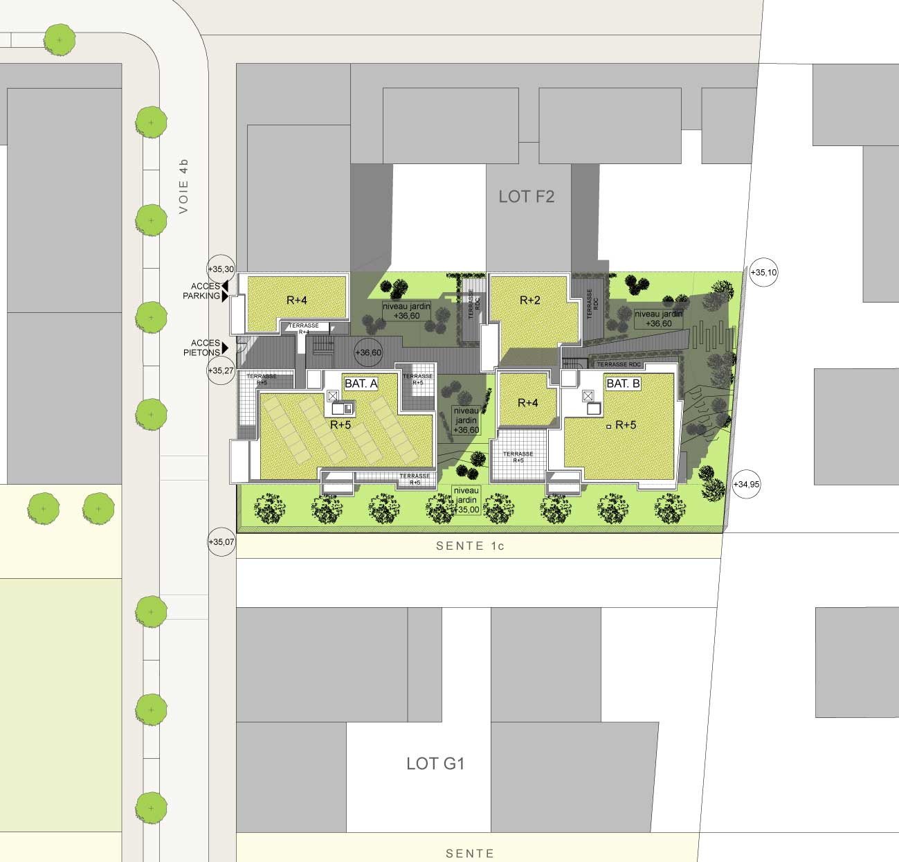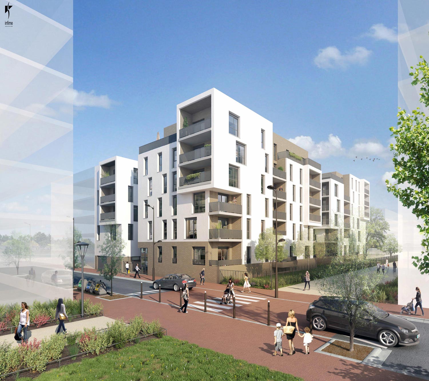 Projet d’un ensemble de 49 logements collectifs sur un socle de parkings inondables, répartis sur plusieurs bâtiments pour assurer la perméabilité de l’îlot aux circulations piétonnes, aux vues et aux espaces végétalisés.