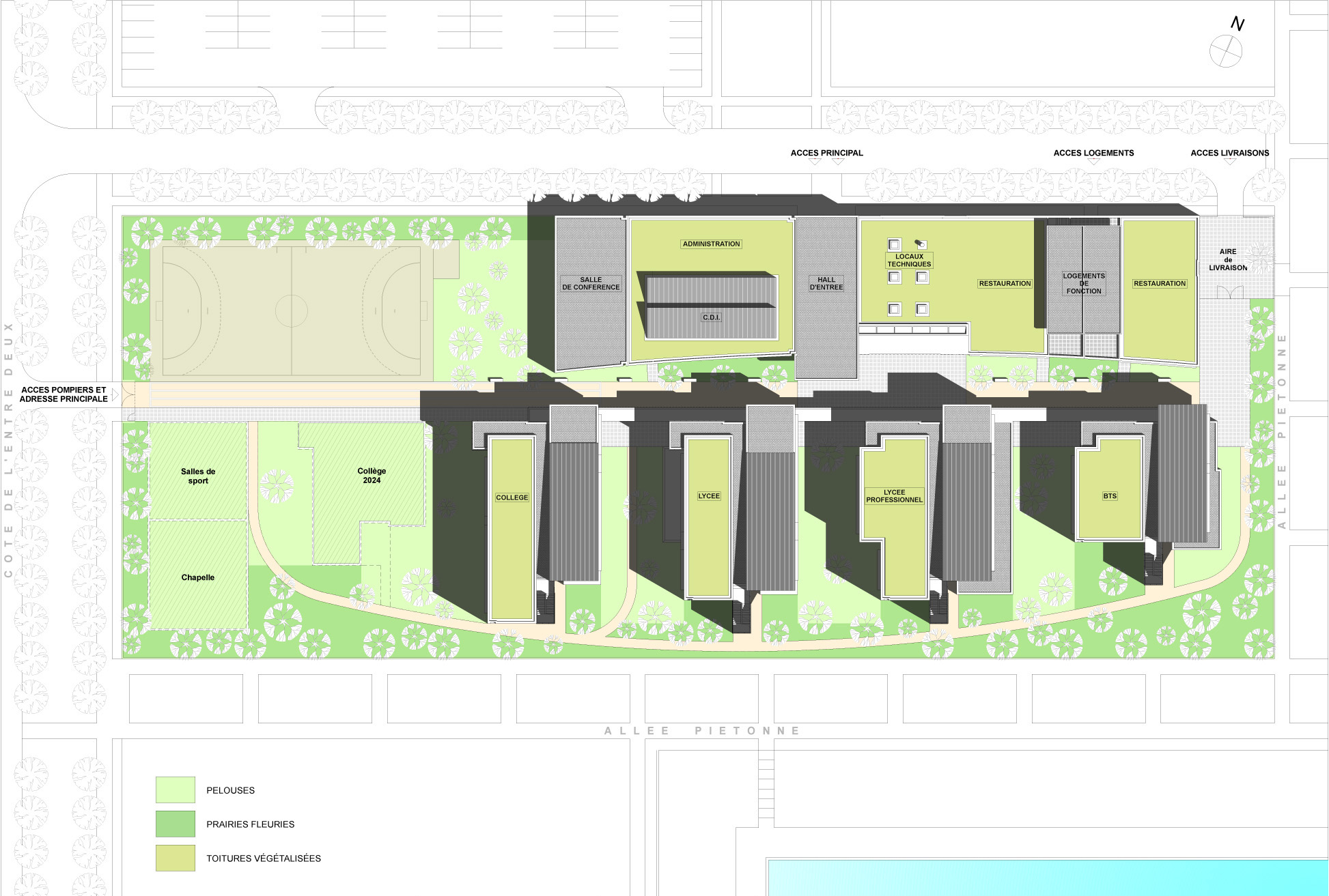 Réalisation d'un lycée polyvalent de 600 élèves et d'un collège de 400 élèves en trois manches distinctes, adaptées à l'évolution prévisionnelle des besoins de ce quartier en phase de forte urbanisation. (SHON 8487 m²)